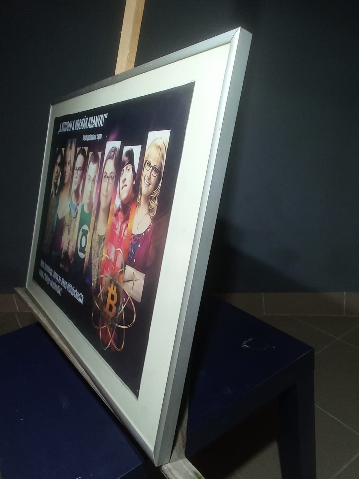 Bitcoin tematikájú, 71×51 cm méretű üvegezett poszter stabil fém keretben. Modern kripto faldekor irodába, home office-ba vagy tech enteriőrbe. Azonnal falra akasztható, jó állapotban.