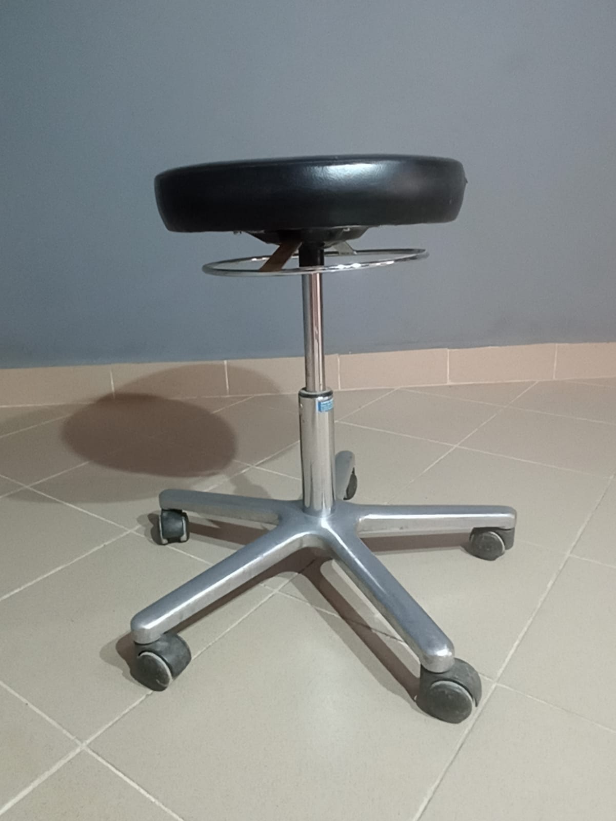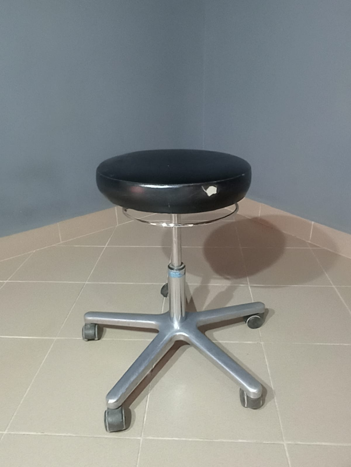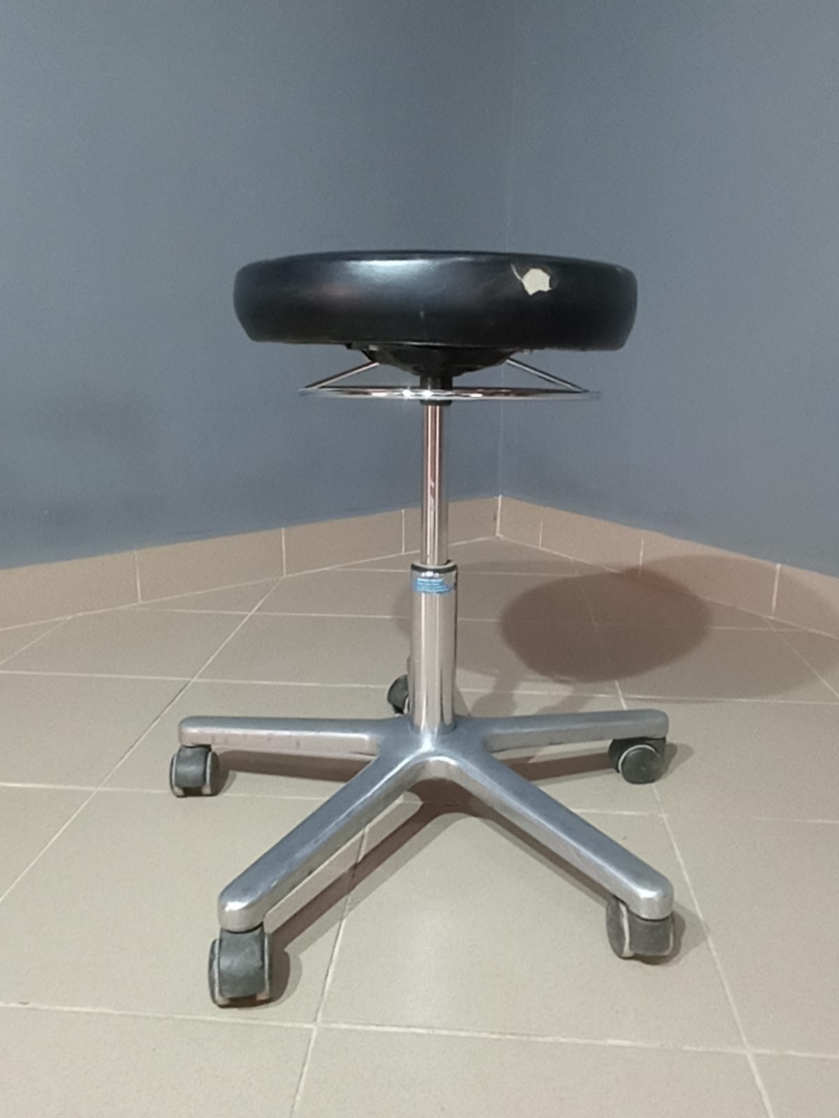 Gurulós, állítható magasságú szék masszív fém lábbal. Praktikus irodai vagy műhely használatra. Kisebb esztétikai sérüléssel.