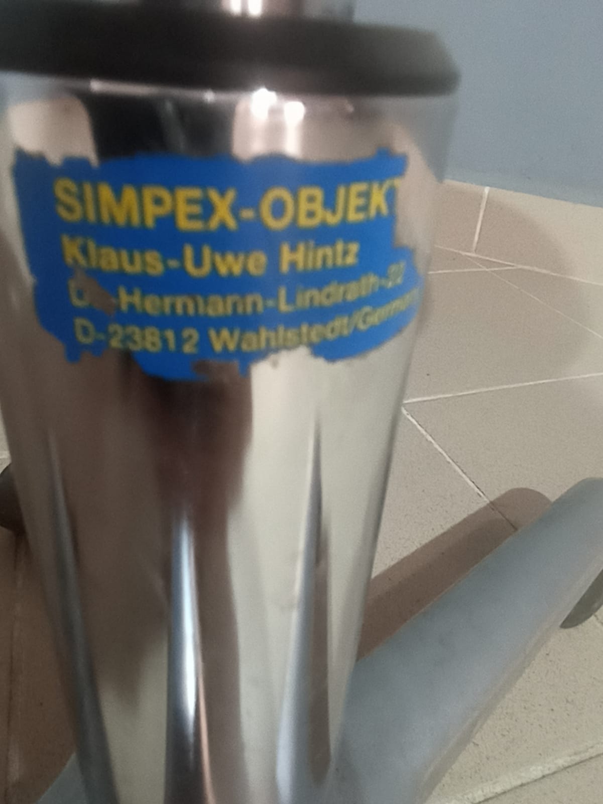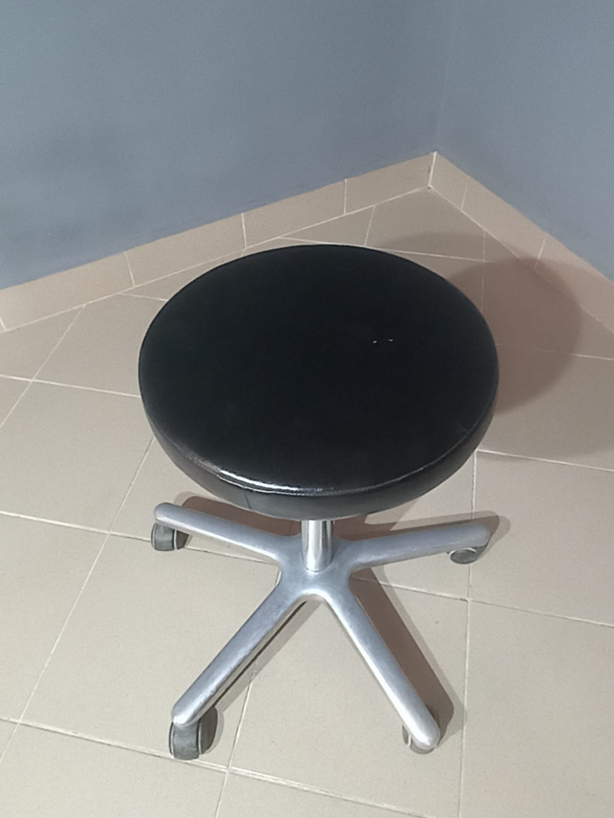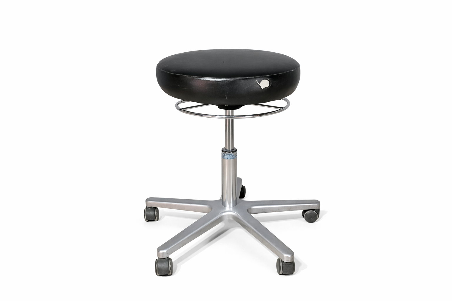 Gurulós, állítható magasságú szék masszív fém lábbal. Praktikus irodai vagy műhely használatra. Kisebb esztétikai sérüléssel.